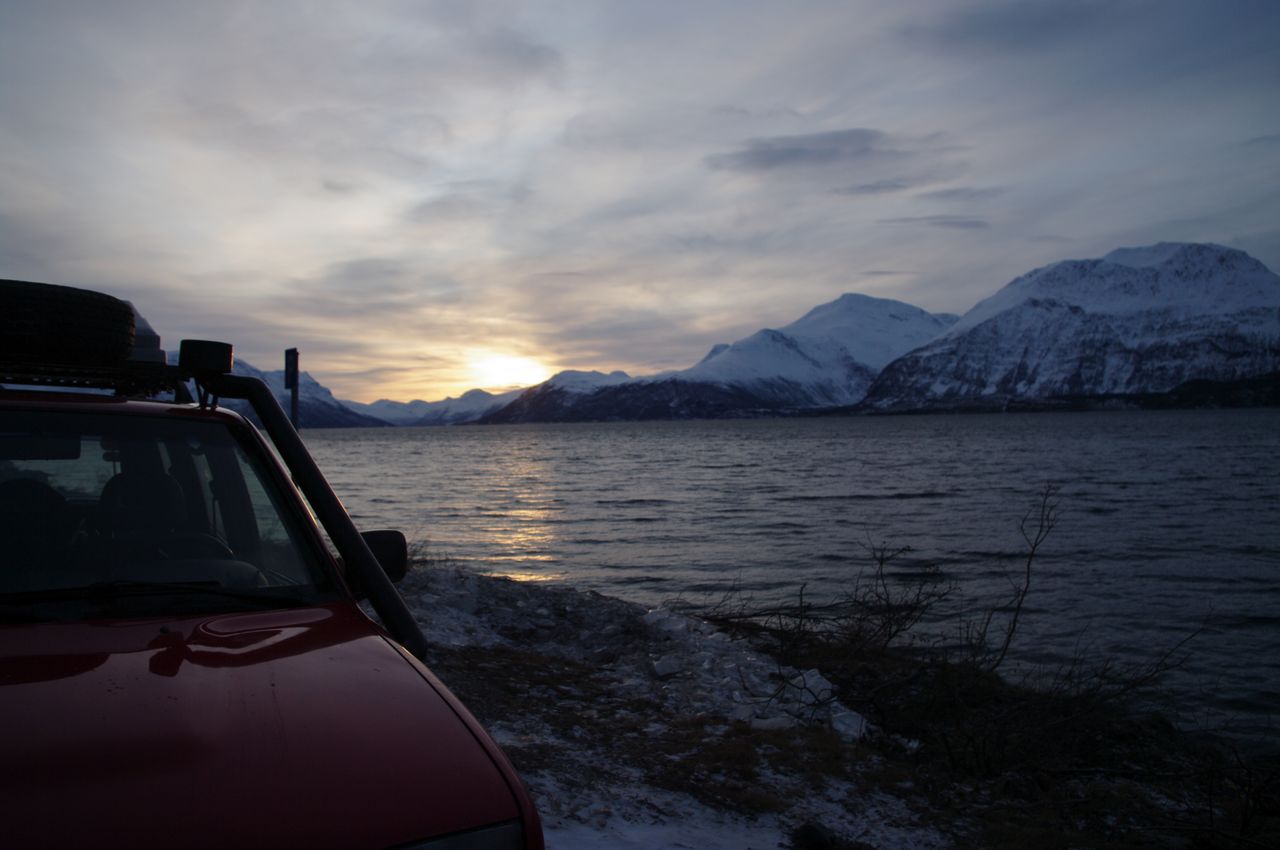 Sonnenuntergang an „unserem“ Fjord, allerdings 65km weiter landeinwärts