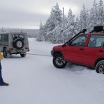 Das war uns dann irgendwann zu langweilig, und wir haben versucht, auf kleinere Nebenstraßen auszuweichen. Fehlanzeige: Nebenstraßen gibt es nicht, die Leute wohnen hier alle an (geräumten) Stichstraßen, die maximal wenige Kilometer von der Bundesstraße abführen. Ungeräumte Feldwege hingegen sind mit ca. 80cm Schneetiefe nach einer halben Wagenlänge unpassierbar. Nach einigen Fehlversuchen haben wir das dann aufgegeben und sind weiter zügig auf der schwedischen Seite (da ist 110 auf der Bundesstraße) gen Lulea gestrebt. Allein auf einem Parkplatz kam der Bergegurt zum Einsatz, und das auch weitestgehend vorsätzlich (s. Foto).