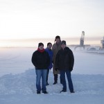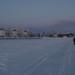 In Lulea waren wir ziemlich genau um 15h, also sehr früh. Dann sind wir gerade noch ein wenig auf der Ostsee (bzw. dem nördlichsten Ausläufer des bottnischen Meerbusens) spazierengegangen, die hier offenbar so dick zugefroren ist, dass die Stadt (?) mit Baggern (sic!) darauf einen Fußweg freigeräumt hat – stabil genug für uns vier Grazien. Dann haben wir dem lokalen Bootshändler noch seine Ausstellung fachmännisch rhetorisch seziert, ein wenig Unordnung in die Auslage gebracht und im Supermarkt ein paar Lagen Schokokekse gegen das kleine Hüngerchen besorgt. Jetzt sitzen wir im Aufenthaltsraum, ringen dem Automaten Kaffee, Kakao und Wiener Melange ab und schreiben unsere obligatorischen Grüße an die Daheimgebliebenen.